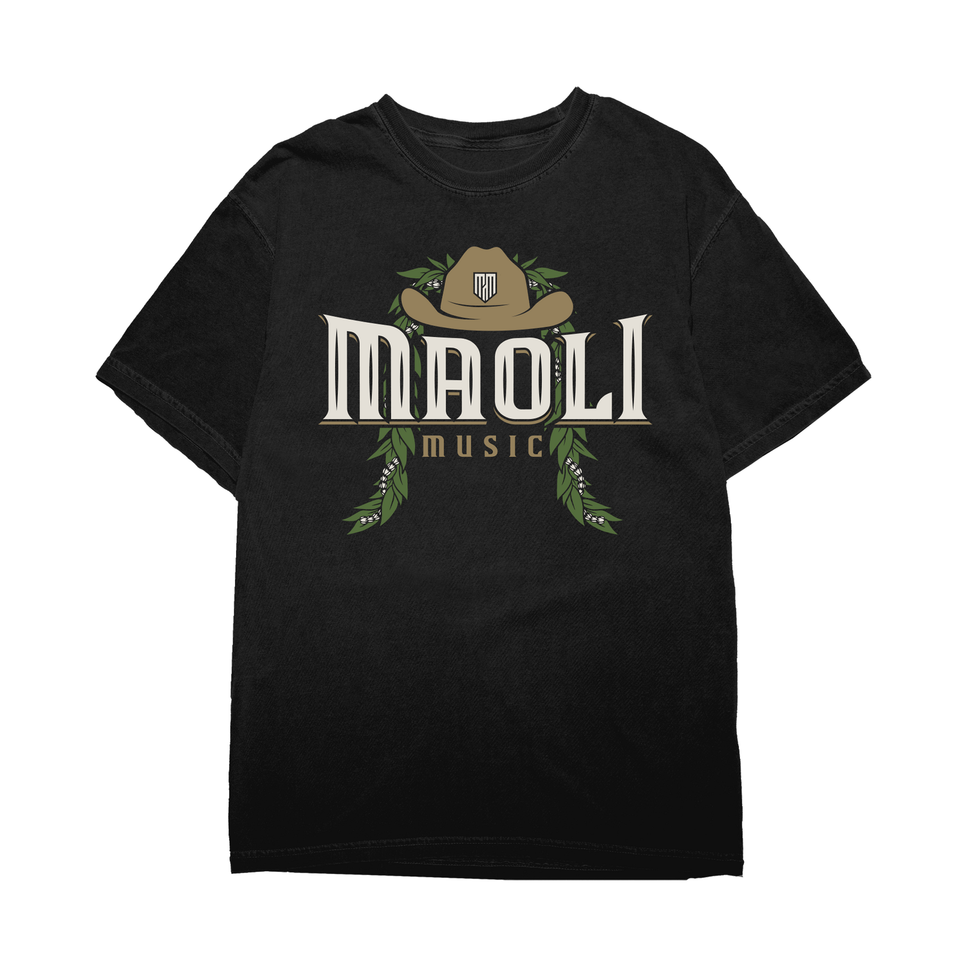 "Maoli Music Lei" design printed on a 100% cotton black garment-dyed t-shirt.