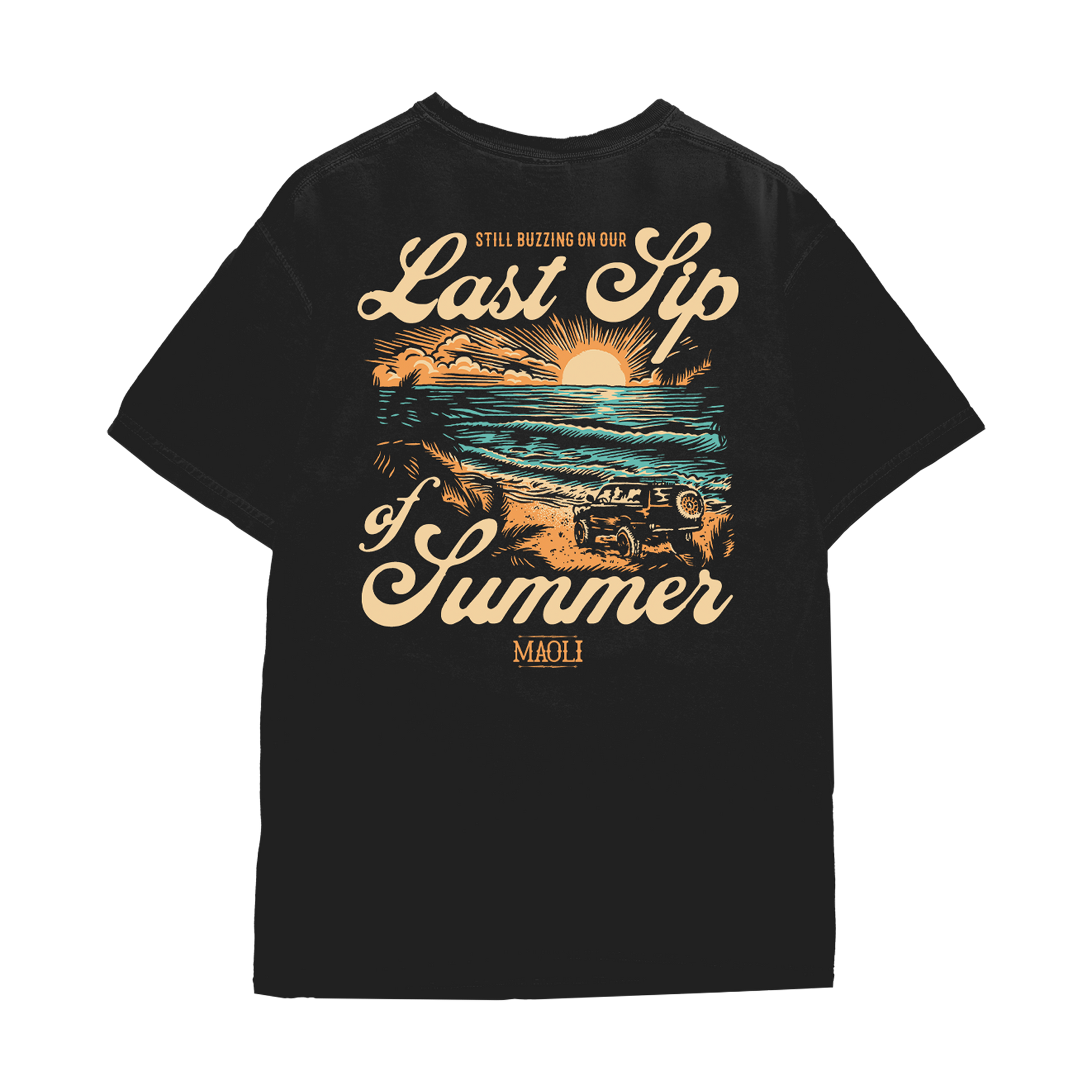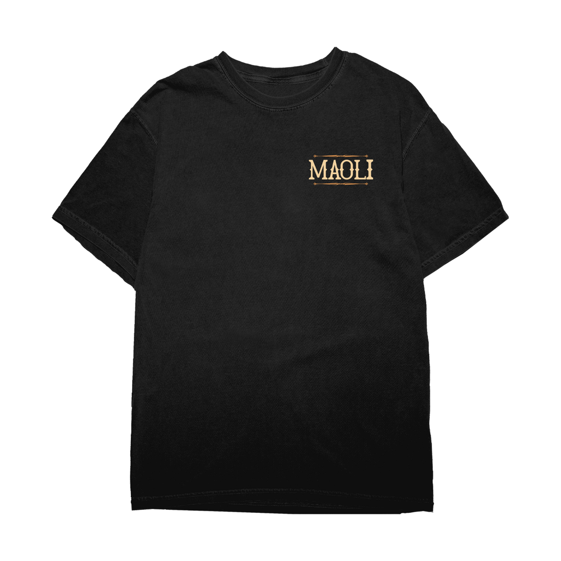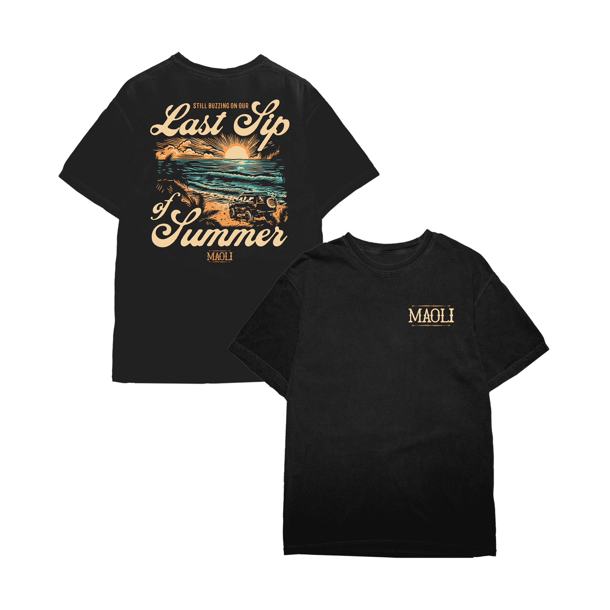 Maoli logo on the front left chest with a 'Sunset Beach' printed on the back of a 100% cotton black garment-dyed t-shirt.