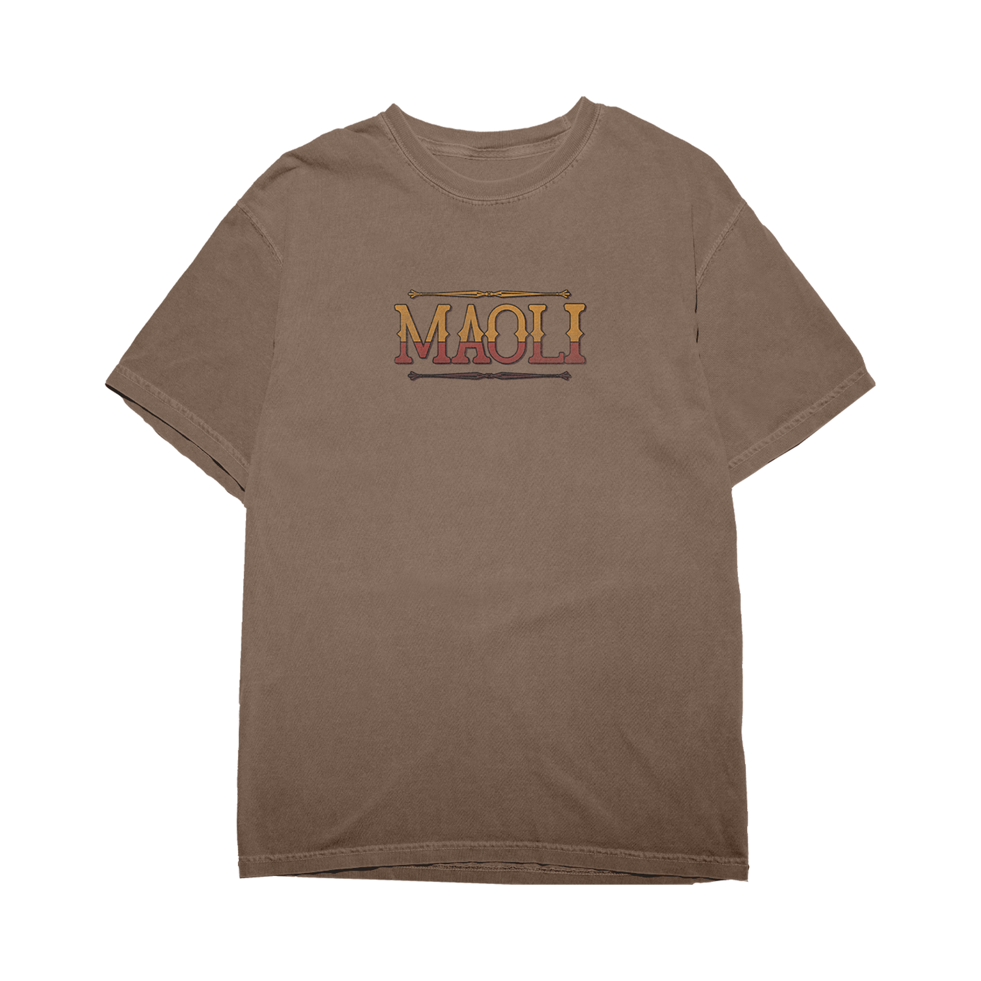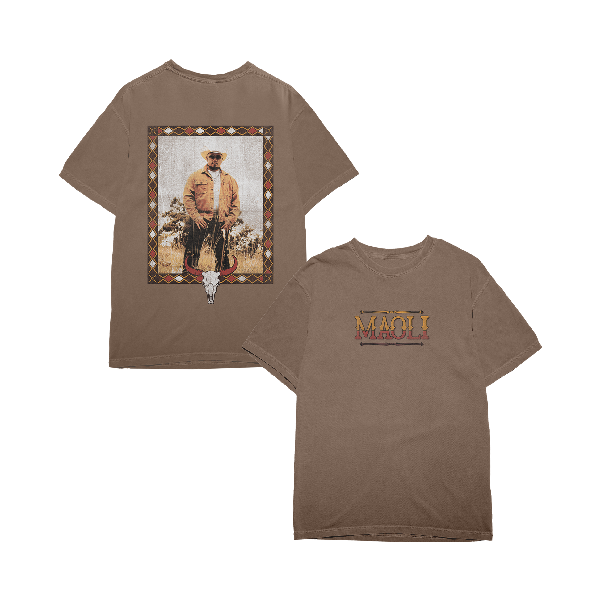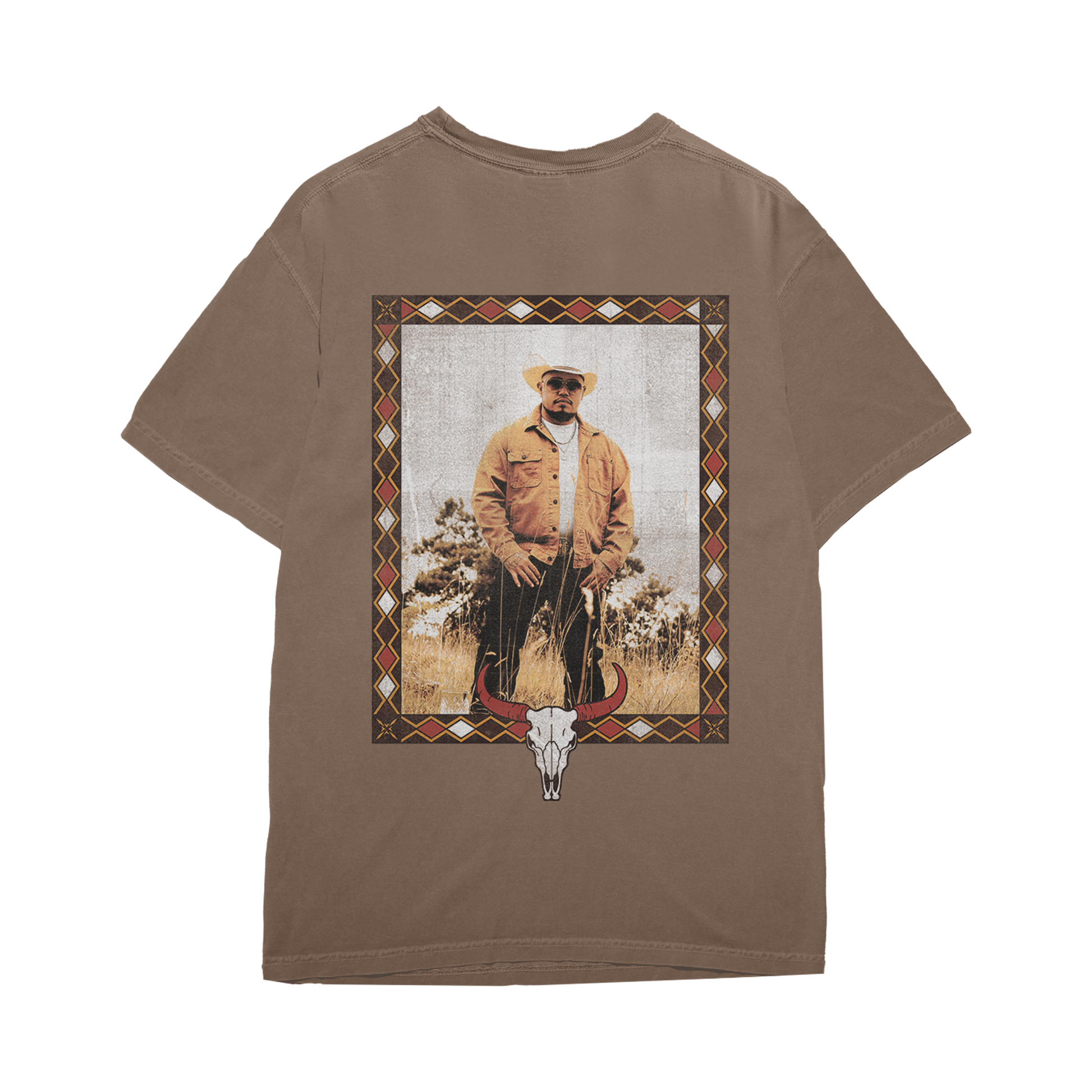 "Western Frame" design printed on a 100% cotton brown garment dyed t-shirt.